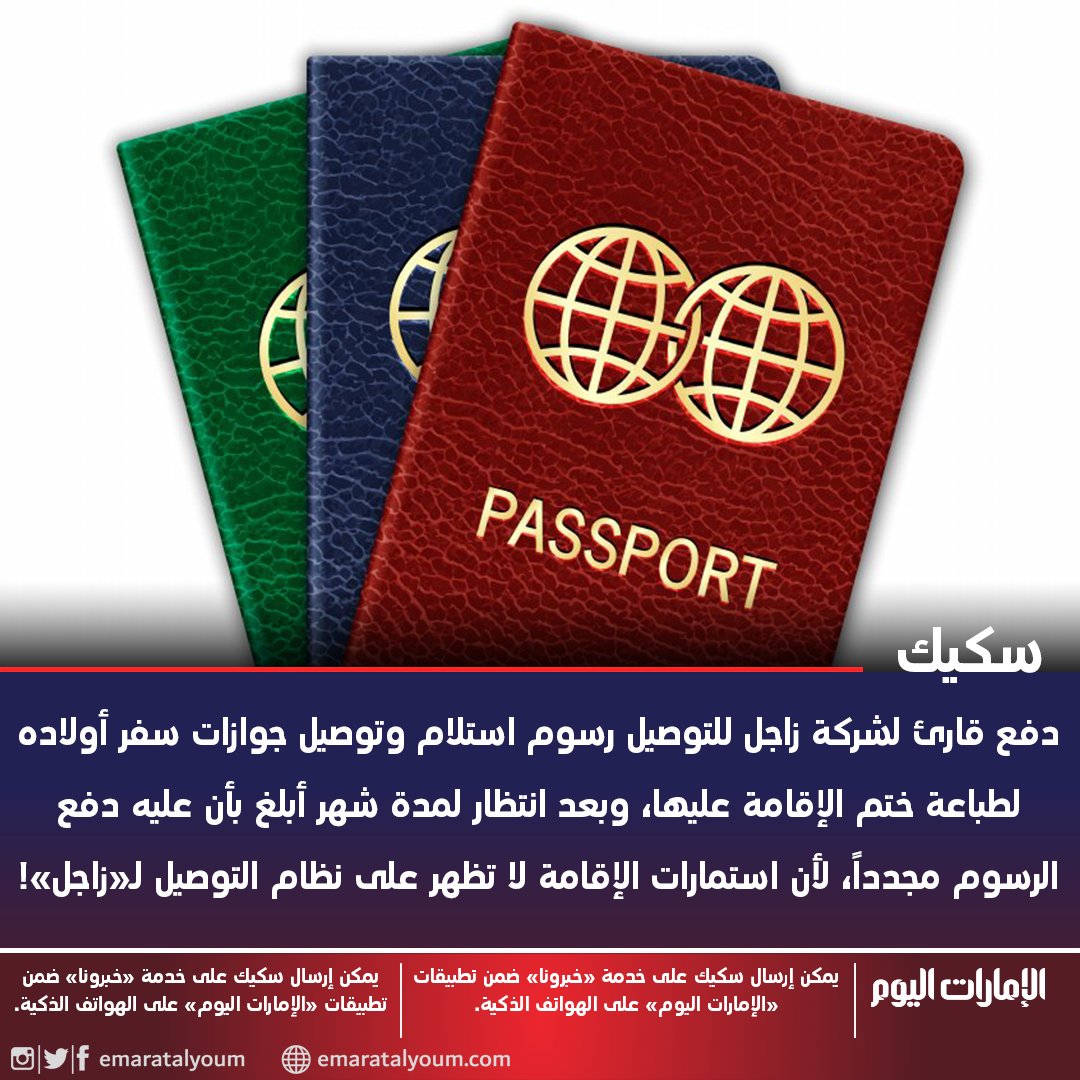 Uzivatel الإمارات اليوم Na Twitteru سكيك دفع قارئ لشركة زاجل للتوصيل رسوم استلام وتوصيل جوازات سفر أولاده لطباعة ختم الإقامة عليها وبعد انتظار لمدة شهر أبلغ بأن عليه دفع الرسوم مجددا لأن